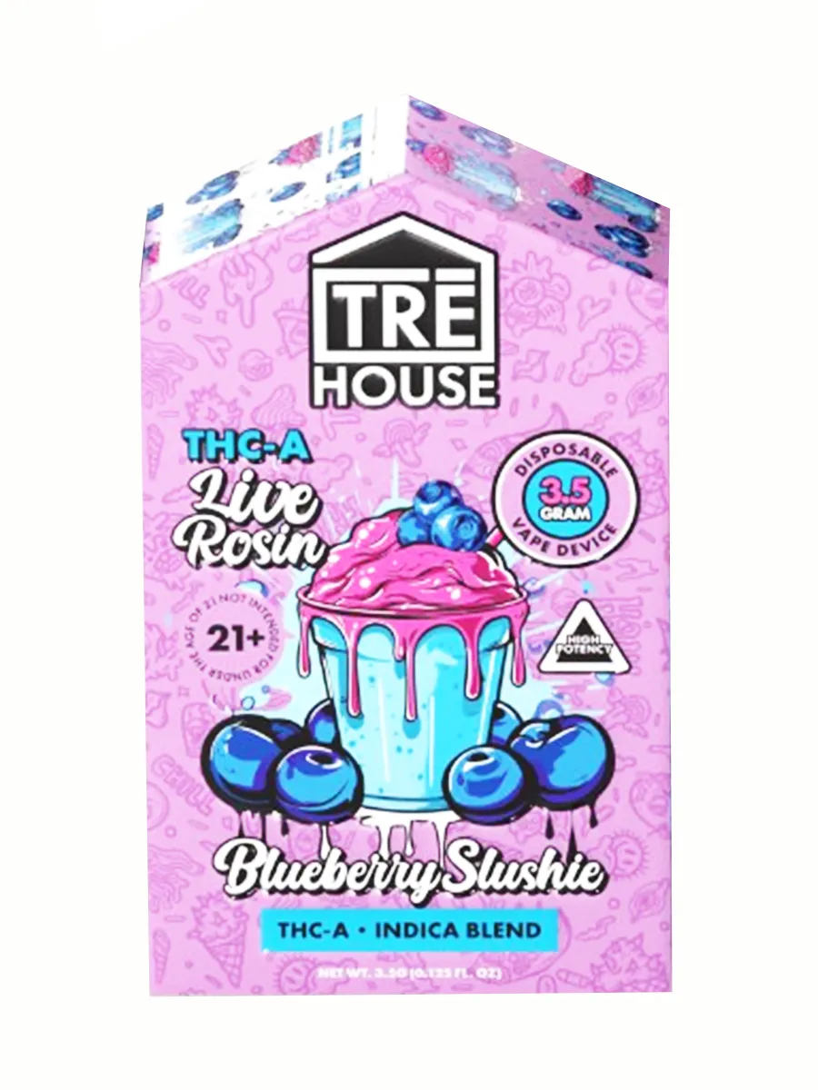Immerse yourself in the luxurious experience of the Blueberry Slushie TRĒ House THC-A Live Rosin Disposable 3.5G. This top-tier disposable vape features a powerful blend of 4 cannabinoids, including Delta 8 THC and THC-P, enhanced with a distinct terpene profile. Crafted to provide an intense, revitalizing, and long-lasting high, each puff offers a premium and unforgettable vaping experience. Enhance your sessions with this exceptional fusion of potency and flavor.