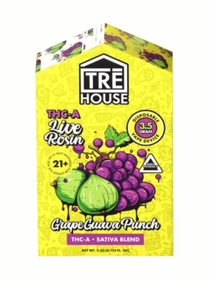 Savor the bold, exotic flavor of Grape Guava Punch TRĒ House THC-A Live Rosin Disposable 3.5G. This top-tier disposable vape features a unique blend of 4 powerful cannabinoids, including Delta 8 THC and THC-P, enhanced by a rich terpene profile. Designed to deliver a revitalizing, long-lasting high, it provides an intense and satisfying experience with each puff. Enjoy the perfect balance of potency and flavor in this premium vape.